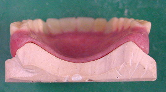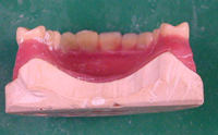入れ歯の土台となっているものは、合成樹脂のアクリルレジンです。これは液と粉末を混ぜ、餅状になったものをフラスコにいれ加熱して重合する。(加熱重合レジン)か、加熱しないで、型に流しこむ(流し込みレジン)で出来ております。 |