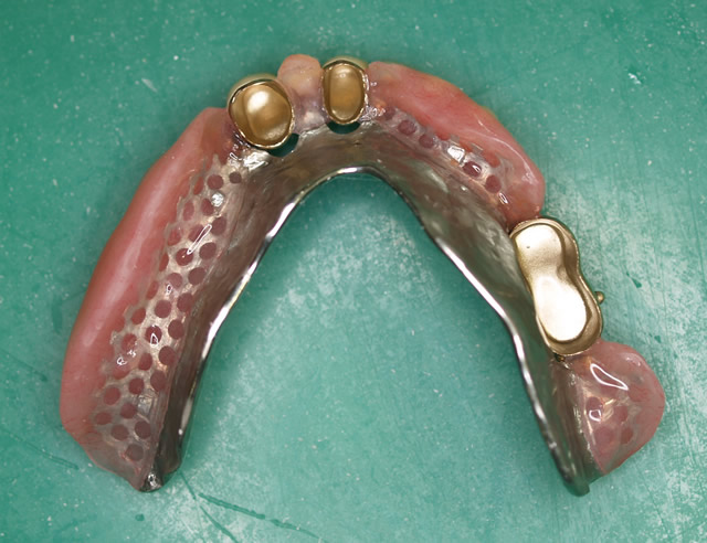 ※注釈 この方の上歯は全部自分の歯でした。こういった上顎が自分の歯の場合は、下顎に負担が掛かり、通常の作り方では上手くいかないことが多いのです、コーヌスで治療しました。