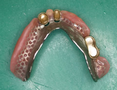 私はこのケースを見てコーヌスで治療しました。咬む力を粘膜と残っている歯で支えればよい訳です。クラスプ義歯では噛む力が粘膜にくいこんで入れ歯が沈下し、歯肉を痛めてしまいます。